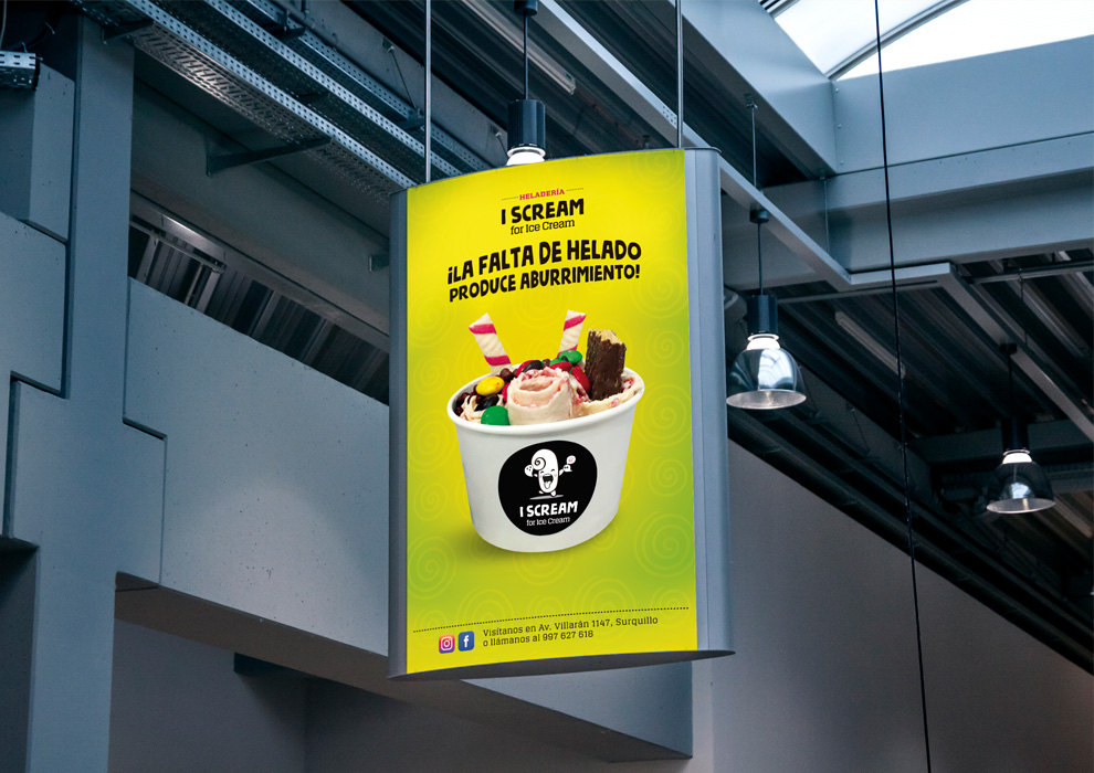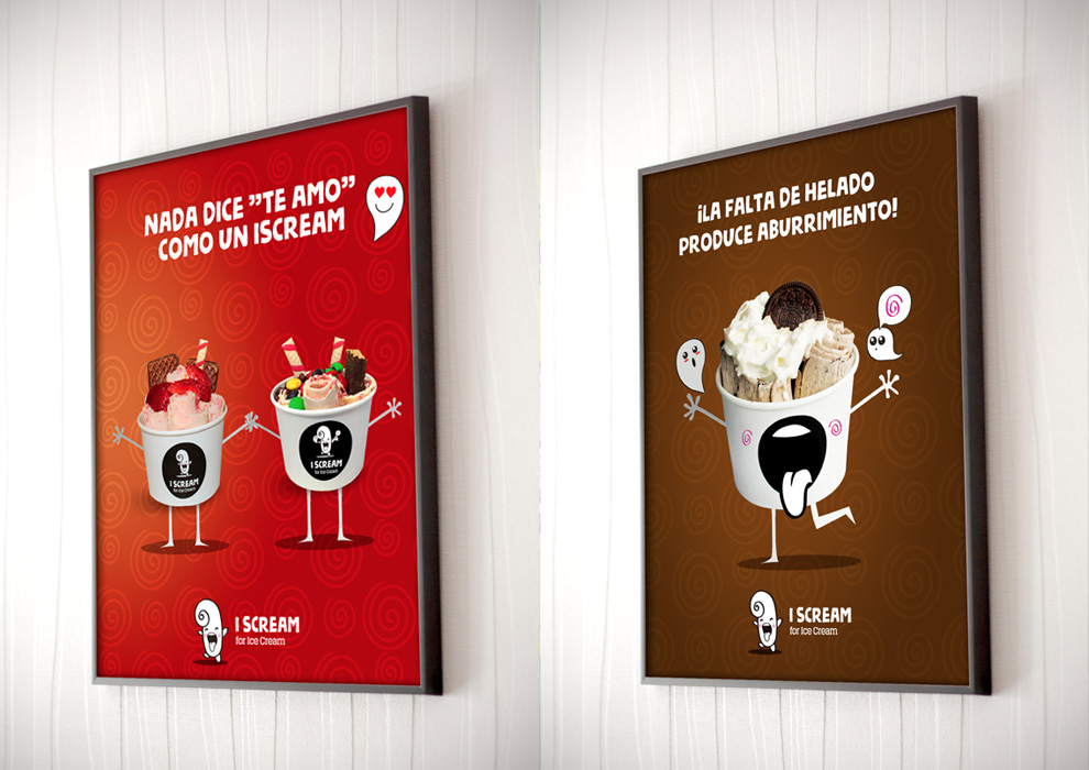 I Scream es una nueva marca de helados, divertida, alocada y muy moderna. El cliente nos pidió desarrollar una marca que parezca internacional. Al investigar, determinamos que la marca debía de ser un personaje, basado el los famosos "Chibi". En la cultura otaku, un chibi es una versión infantil de un personaje, con ojos brillantes y personalidad traviesa.